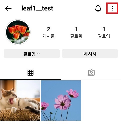 ✓ 스토리 읽음 표시를 삭제하기 위해서는, 상대방을 차단하시면 되는데요, 상대방을 차단하시려면, 상대방의 인스타 프로필에 접속하신 뒤, 상단에 보이시는 설정을 눌러줍니다.