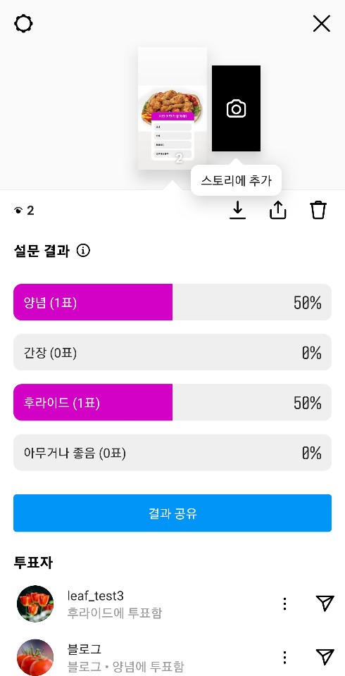 ✓ 만일, 위와 같이 상대방이 본인이 올린 스토리에 투표를 한 뒤, 본인이 올린 인스타 투표를 직접 읽게 된다면 어떻게 될까요?