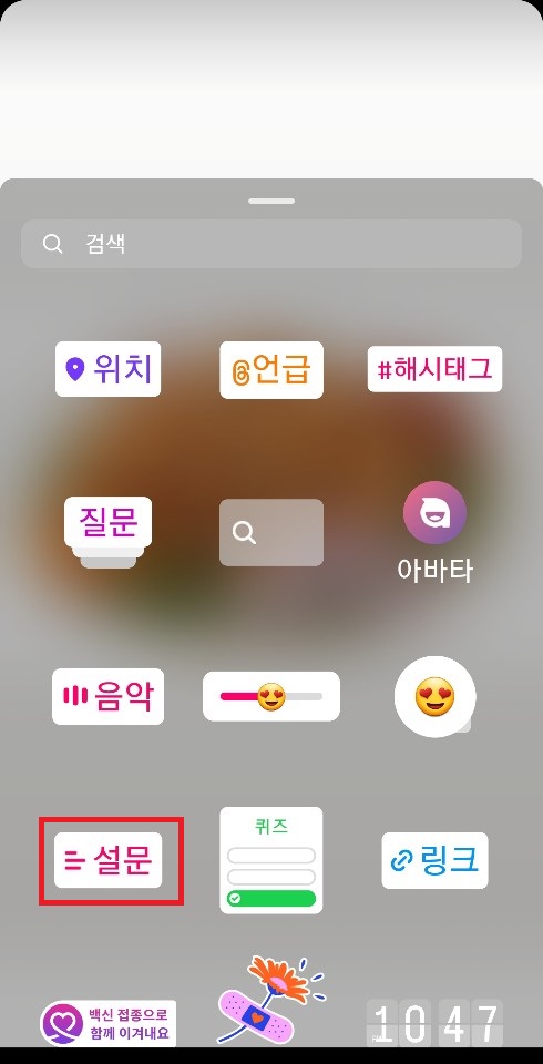 ✓ 그러면 다양한 스티커가 나타나게 되는데요, 여기서 왼쪽 아래 보이시는, 설문 스티커를 눌러, 첨부해주시면 됩니다.