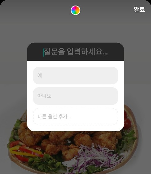 ✓ 설문 스티커를 첨부하시게 되면, 위와 같이 질문을 입력하라는 화면이 나타나게 되는데요, 여기서 투표하고 싶은 질문을 입력해줍니다.