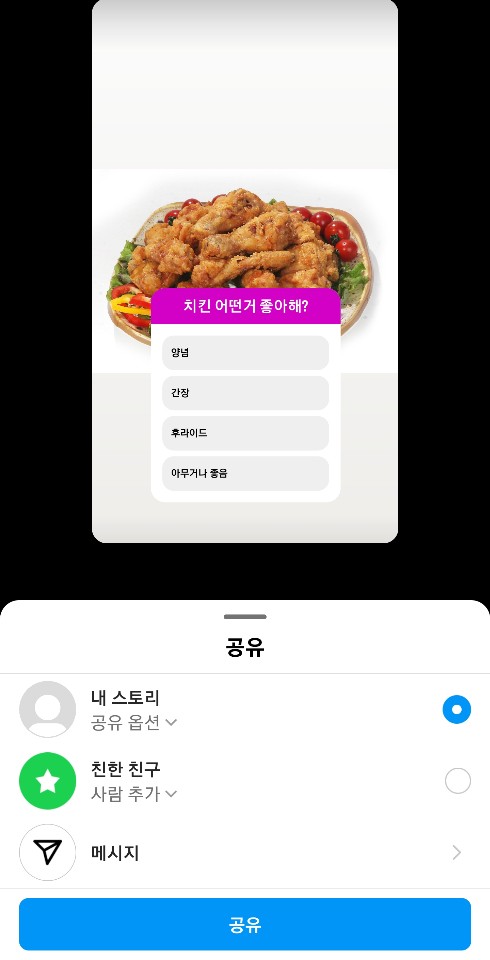 ✓ 위와 같이 모든 투표 설정을 마쳤다면, 이제 이 투표를 스토리에 공유하시면 되는데요, 스토리에 공유하기 전, 이 투표에 대한 공개 범위를 설정하시면 됩니다.