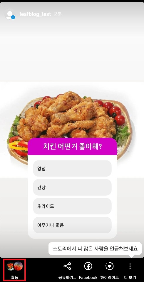 ✓ 위와 같이 본인의 계정으로 로그인 한 뒤, 본인이 올린 스토리를 읽어보았습니다. 그 결과, 아래 활동란에 스토리를 읽은 사람의 계정이 나타나게 된다는 것을 알 수 있습니다.