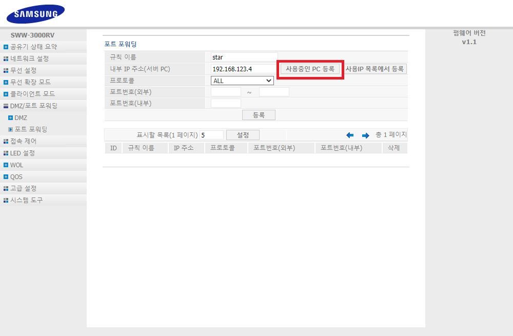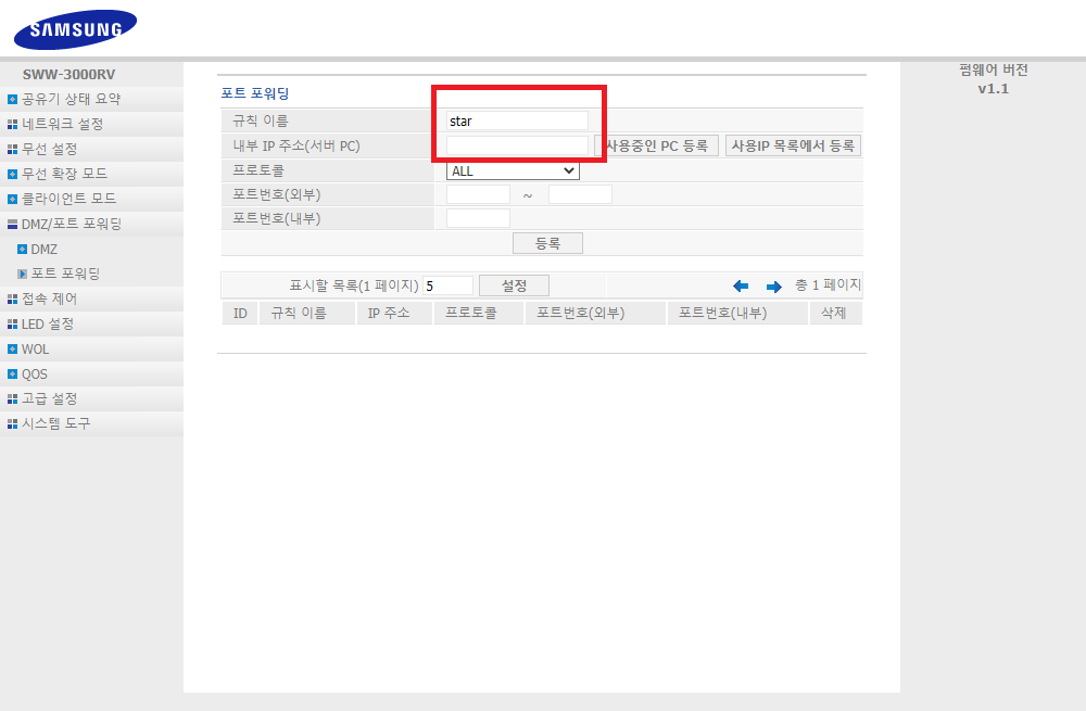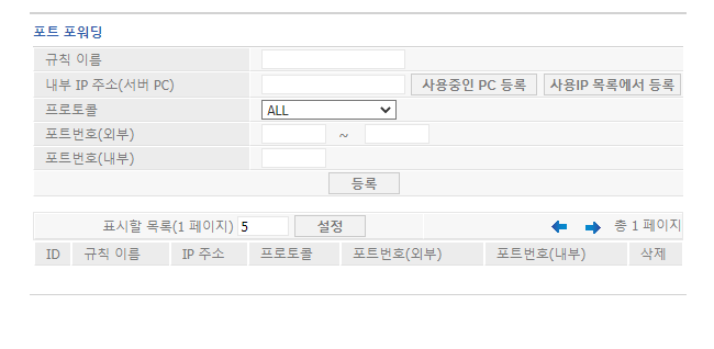 ✓ 포트 포워딩을 찾아 들어오시게 되면, 위와 같이 규칙과 내부 IP 주소, 프로토콜 등, 포트번호 등을 입력할 수 있는 화면이 나타납니다.