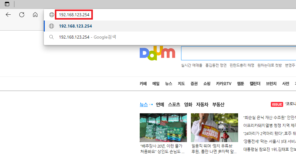 ✓ 그런 다음, 알아낸 공유기 주소를, 인터넷 브라우저에 입력하시면 되는데요, 위와 같이 인터넷 브라우저를 실행하여, 주소창에 공유기 주소를 입력해줍니다.