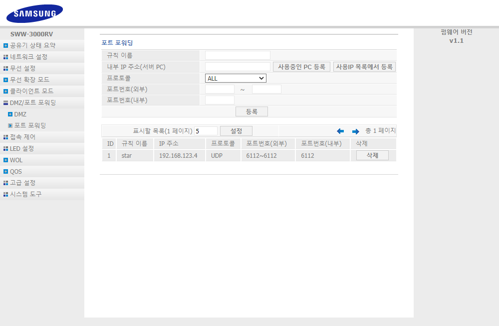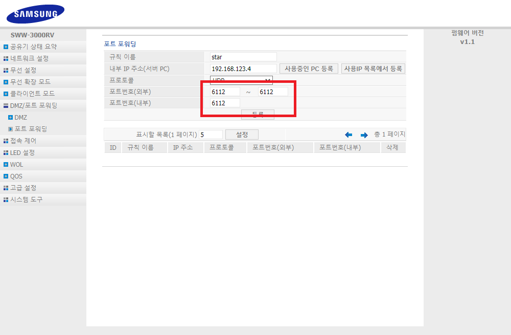 ✓ 그런 다음, 아래 포트 번호 외부와 내부 전부 6112로 변경해주신 뒤, 등록을 해주시면, 공유기 설정이 완료된다는 것을 알 수 있습니다.