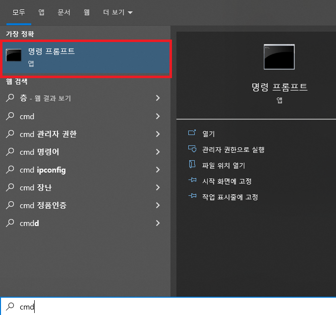 ✓ 우선, 윈도우에서 검색 기능을 통해, 명령 프롬프트를 입력하여 들어와 줍니다. 그러면 위와 같이 특정 명령을 실행할 수 있는 화면이 나타납니다.