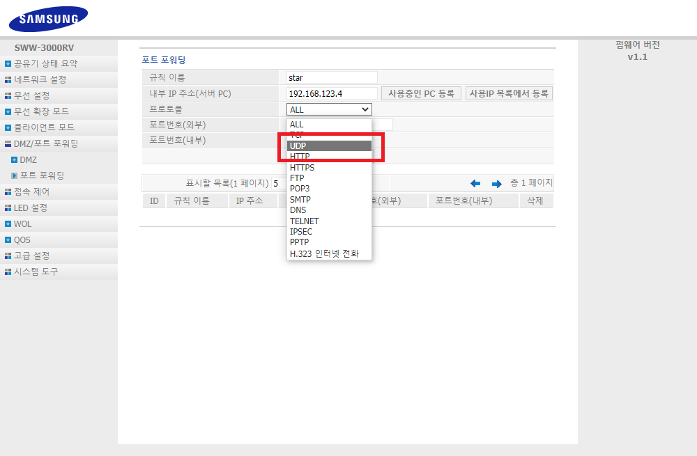✓ 그런 다음, 내부 IP 주소를, 오른쪽에 보이시는, 사용 중인 PC 등록 버튼을 눌러, 자동으로 입력해주시면 됩니다. 그런 다음, 아래 프로토콜을 눌러, UDP를 찾아 눌러주시면 됩니다.
