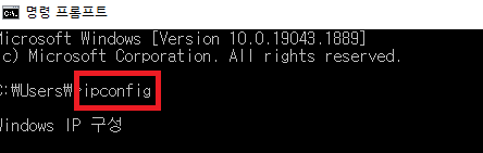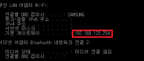 ✓ 여기서 본인의 공유기 주소를 알아내기 위해, ipconfig라는 명령어를 입력한 뒤, 제일 아래로 내려가, 기본 게이트웨이를 확인해주시면 됩니다.
