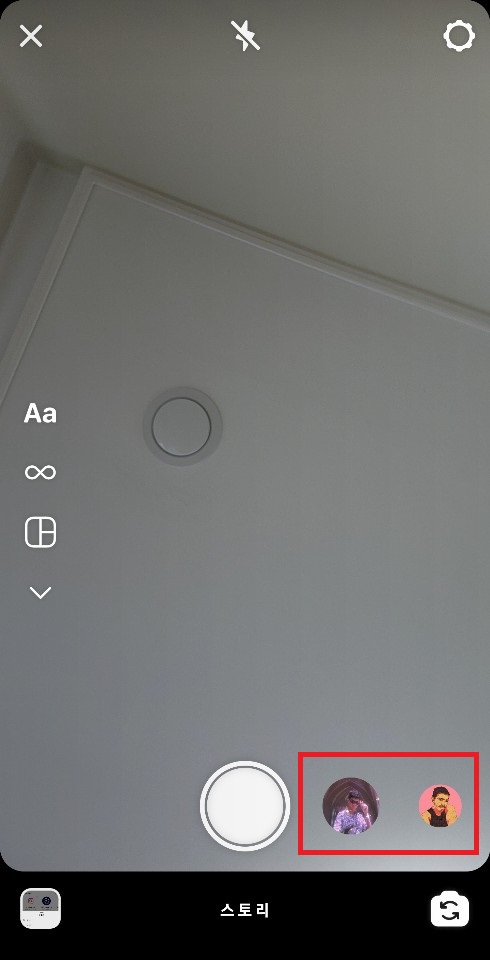 ✓ 그러면, 위와 같이 스토리와 관련된 다양한 항목이 나타나는데요, 여기서 카메라 표시 오른쪽에 보이시는, 다양한 필터를 오른쪽으로 넘겨줍니다.