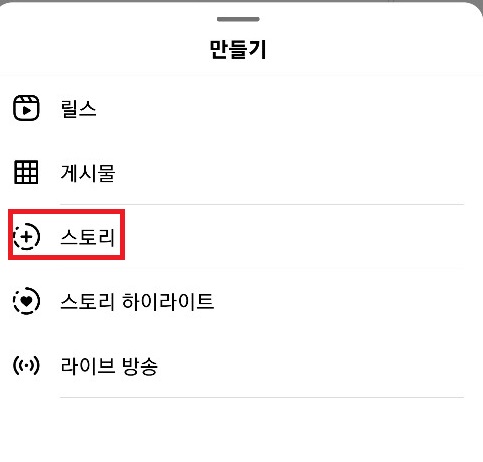 ✓ 우선, 인스타그램 얼굴 필터를 적용하기 위해서는, 특정한 스토리나 게시물을 게시해야 합니다. 우선, 인스타그램 만들기를 누른 뒤, 스토리를 눌러보았습니다.