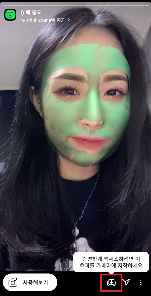✓ 만일, 위와 같이, 마스크 팩 필터가 마음에 드신다면, 마스크 팩 필터를 누른 뒤, 아래 카메라에 저장 버튼을 눌러, 언제든 사용할 수 있도록 저장해줍니다.