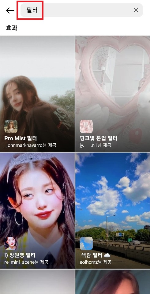 ✓ 필터를 검색하게 되면, 위와 같이 다양한 필터가 나타나게 되는데요, 여기서 본인이 마음에 드는 필터를 골라주시면 됩니다.