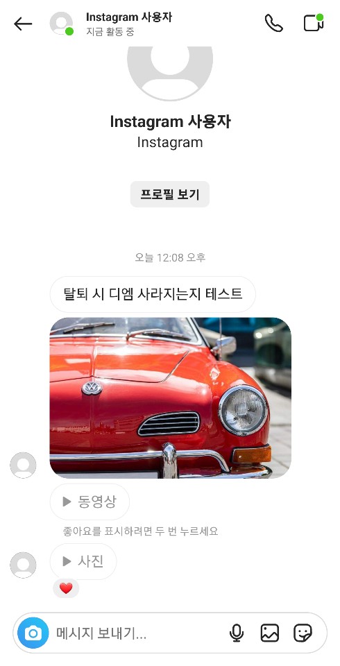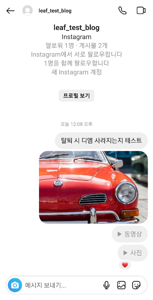 ✓ 인스타 탈퇴하면 디엠, 사진, 스토리를 보낸 내역이 사라지는지, 혹은 볼 수 없게 되는지 확인하기 위해, 사진, 동영상, 스토리를 보내보도록 하겠습니다.