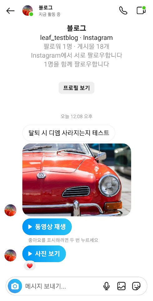 ✓ 우선 위와 같이 상대방과의 디엠 화면에 접속한 뒤, 위와 같은 문구로, 메시지를 보내보았습니다. 그런 다음, 갤러리에서, 적절한 사진을 선택하여, 상대방에게 사진 또한 보내보았습니다.