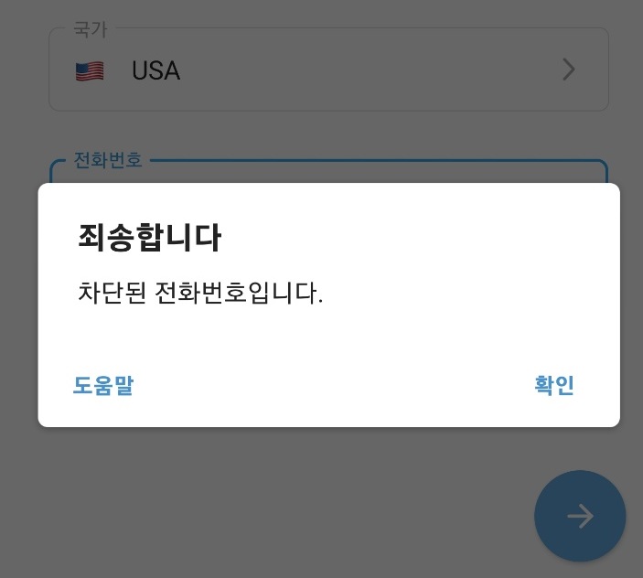 만일, 정상적인 번호나 인증이 되지 않는 번호라면, 위와 같이 차단된 전화번호라는 문구가 나타나면서, 인증이 진행되지 않습니다.