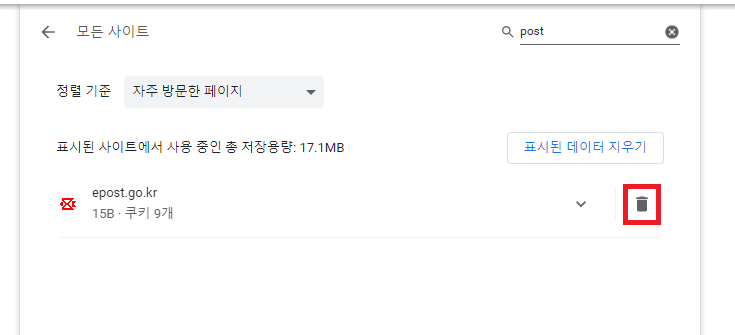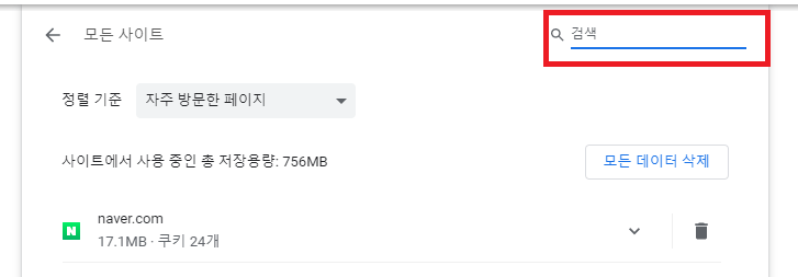 ✓ 그러면 위와 같이, 모든 사이트의 쿠키 및 데이터를 볼 수 있는데요, 여기서 팝업을 다시 보고 싶은 사이트 주소를 검색해줍니다.