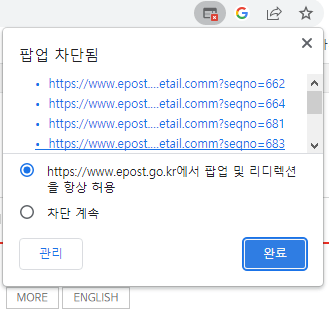✓ 여기서 이 팝업 아이콘을 눌러주신 뒤, 팝업 및 리디렉션을 항상 허용이라는 항목에 체크해주신 뒤, 완료를 눌러주시면 됩니다.