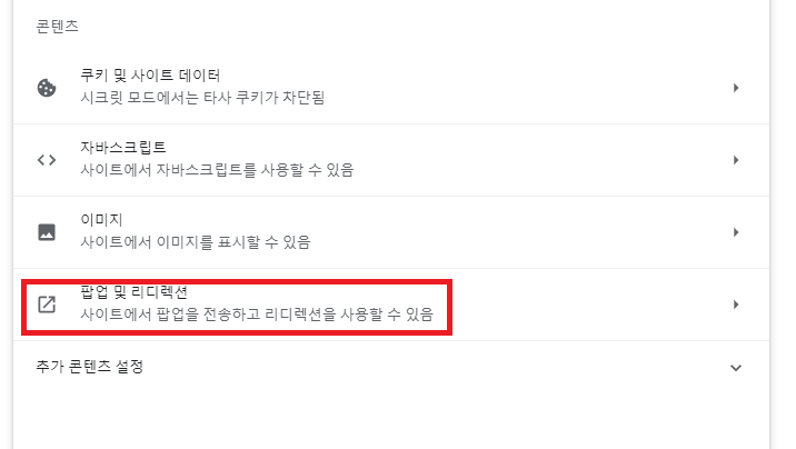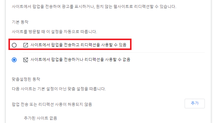 ✓ 그런 다음, 아래 팝업 및 리디렉션을 눌러주신 뒤, 스크롤을 조금 아래로 내려주시면 됩니다.