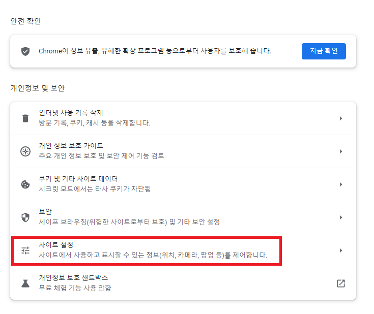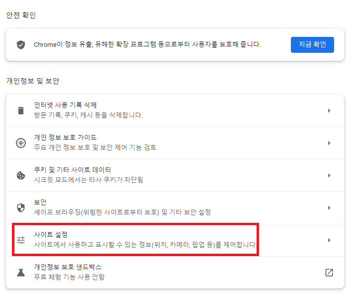 ✓ 이를 위해서, 아까 들어갔었던 개인 정보 및 보안 - 사이트 설정에 들어가 주셔야 합니다.