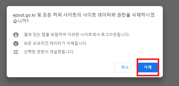 ✓ 만일 사이트의 팝업을 다시 보고 싶으시다면, 전체 기간의 인터넷 사용 기록을 삭제하시면 되지만, 이 경우, 다른 사이트에 저장되어있던 여러 데이터 또한 삭제되므로, 다른 설정이 필요합니다.