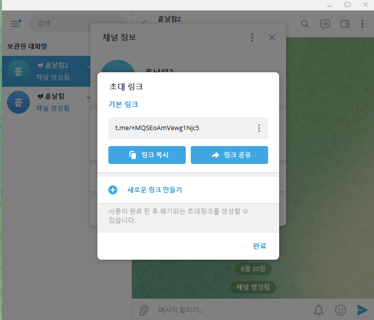 다음으로, 비공개 채널 검색을 위해, 비공개 채널을 선택해 보았습니다. 비공개 채널은 공개 채널과는 달리, 본인이 초대 링크 주소를 설정할 수 없고, 정해진 초대 링크만 나타난다는 것을 알 수 있습니다.
