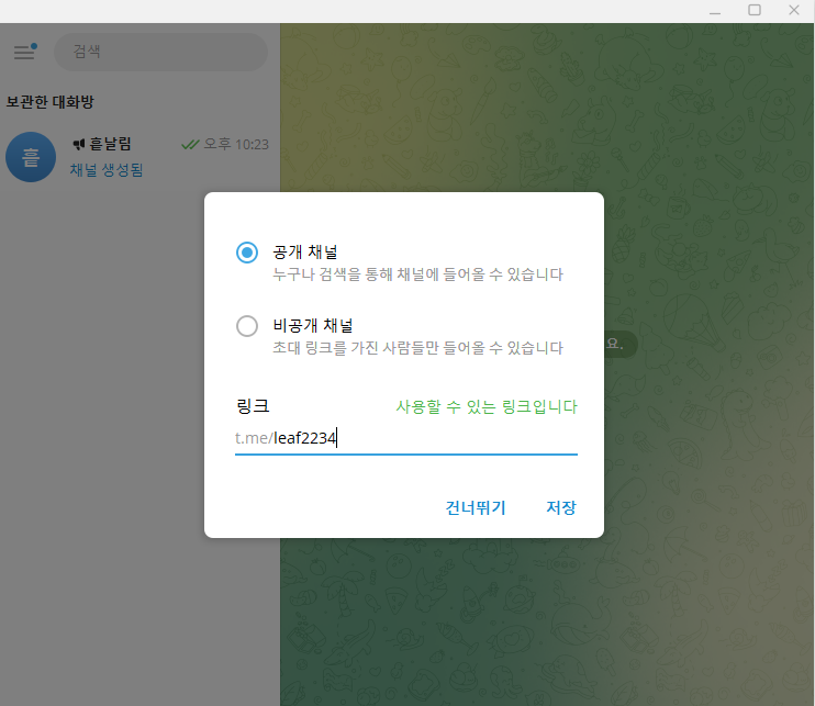 그런 다음, 공개 채널을 선택하신 뒤, 아래 링크에 중복되지 않는 주소를 입력해 주시고, 저장을 눌러주시면 됩니다.