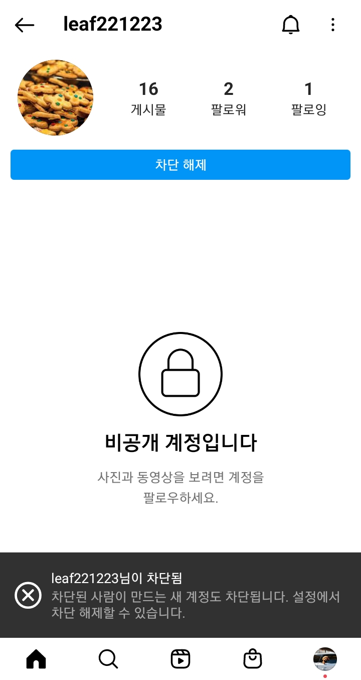 ✓ 상대방을 차단하게 되면, 위처럼 상대방의 계정이 비공개 계정으로 전환되며, 상대방과의 팔로우가 즉시 끊어지게 됩니다.