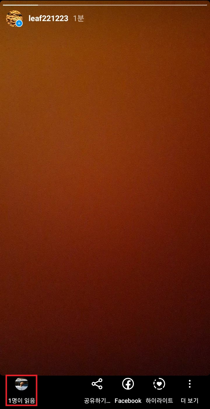 ✓ 그런 다음, 다시 본계정으로 로그인한 뒤, 본인의 스토리를 확인해보았는데요, 여기서 아래에 본인이 올린 스토리를 읽은 사람의 프로필과 사람의 수가 표시되는 것을 알 수 있습니다.