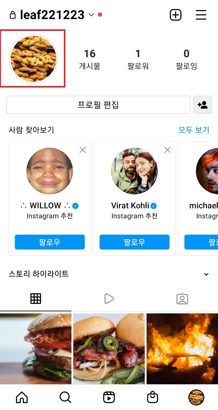 ✓ 이제, 부계정으로 로그인하여, 아까 본계정에서 올렸던 스토리를 읽어보도록 하겠습니다. 인스타그램 부계정으로 로그인하였습니다.