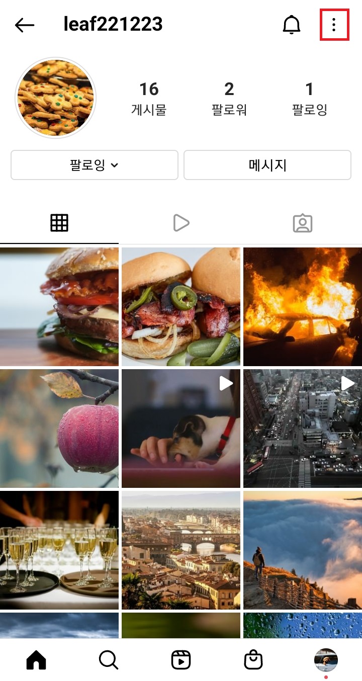 ✓ 상대방의 인스타 계정을 차단하기 위해, 다시 부계정으로 로그인하였고, 상대방의 인스타 프로필을 누른 뒤, 오른쪽 위에 있는 점 3개 표시를 눌러줍니다.
