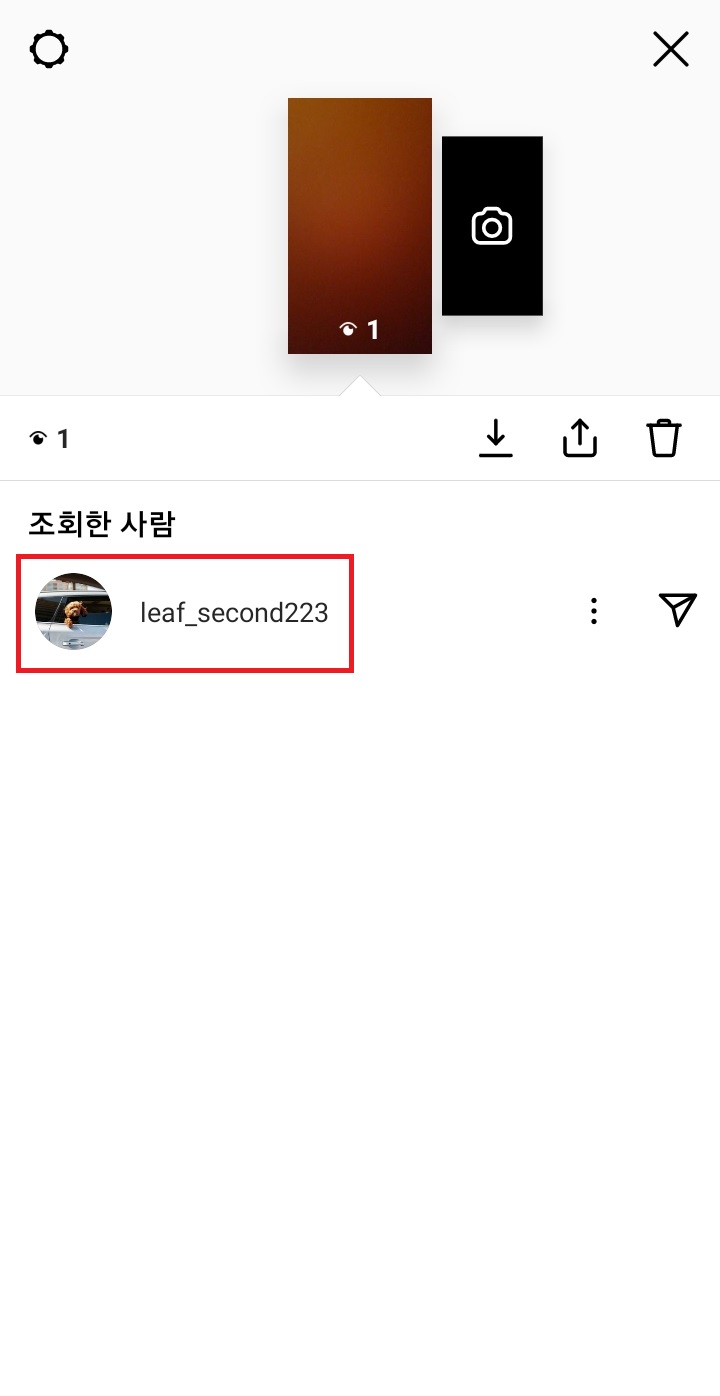✓ 이 버튼을 누르게 되면, 스토리를 조회한 사람의 자세한 아이디와, 몇 명이 스토리를 조회했는지에 관한 정보가 나타납니다.