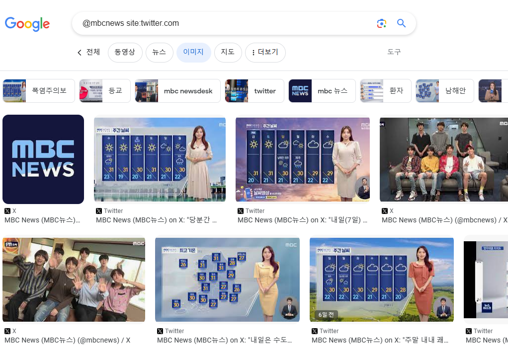 이때, 검색하려는 계정의 오른쪽에 site:twitter.com을 넣어주시게되면, 트위터에서 작성한 게시물만 나타나게 됩니다.