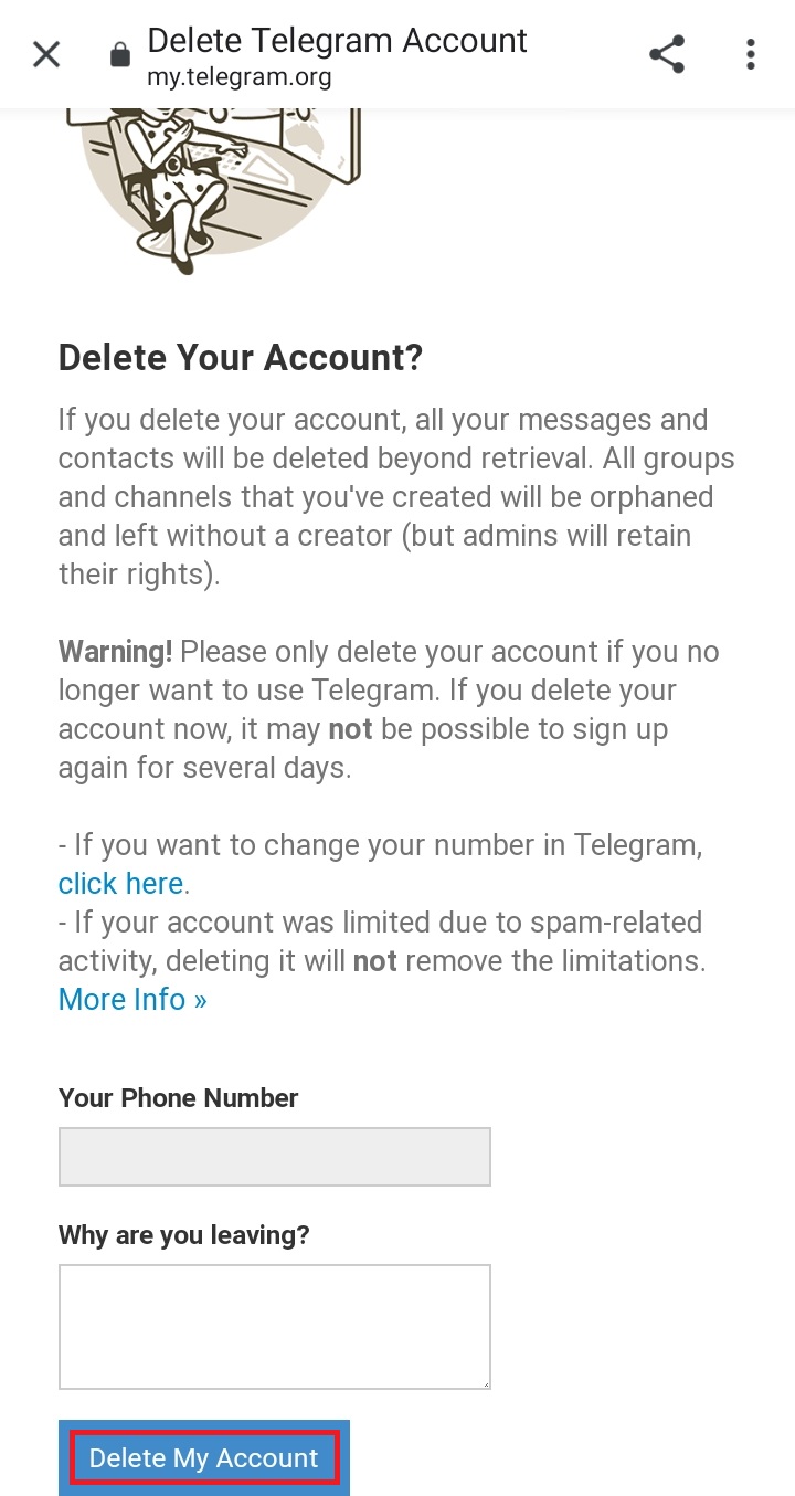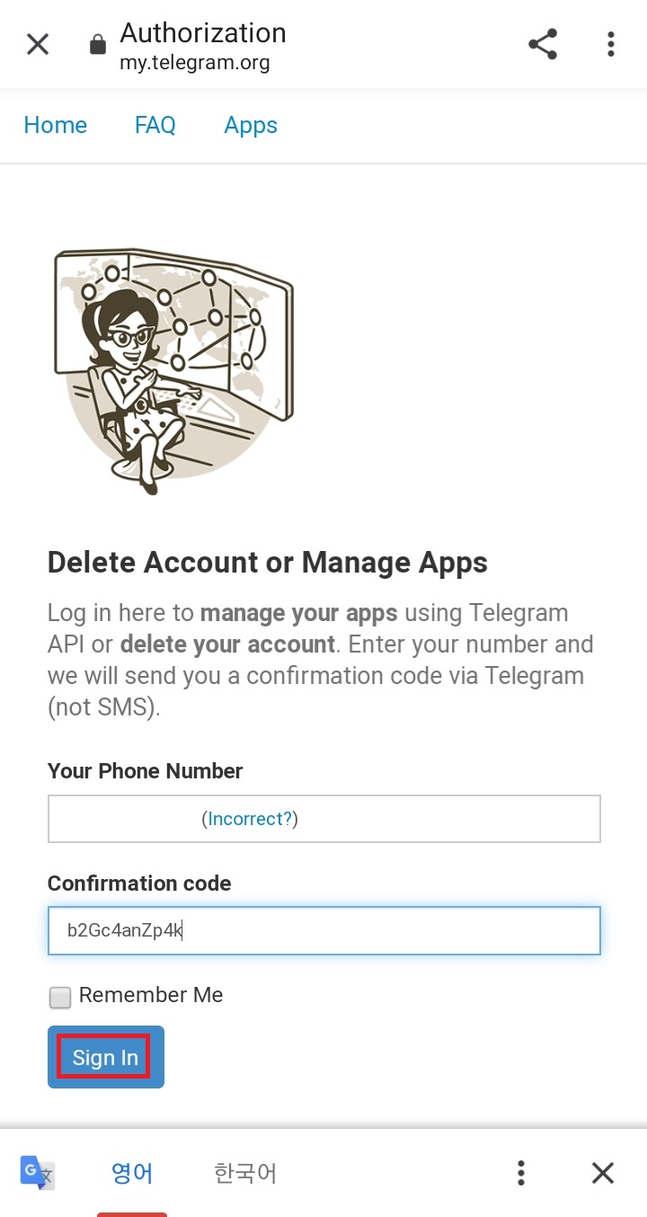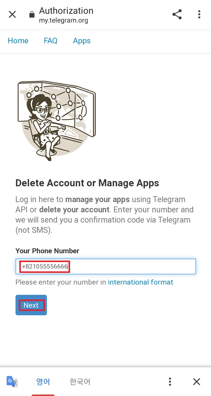 ✓ 위 링크를 누르게 되면, 그 즉시, 텔레그램 계정 삭제 페이지로 이동되는데요, 여기서 간단히 본인의 텔레그램 계정을 삭제하실 수 있습니다.