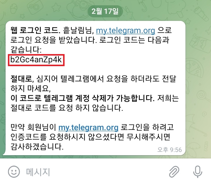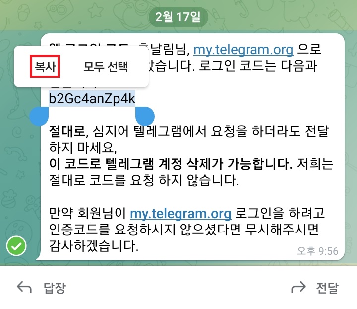 ✓ 그러면, 위처럼 계정 삭제에 관련된 코드가 발송되는 것을 알 수 있는데요, 여기서 이 코드를 정확히 복사해주시면 됩니다.