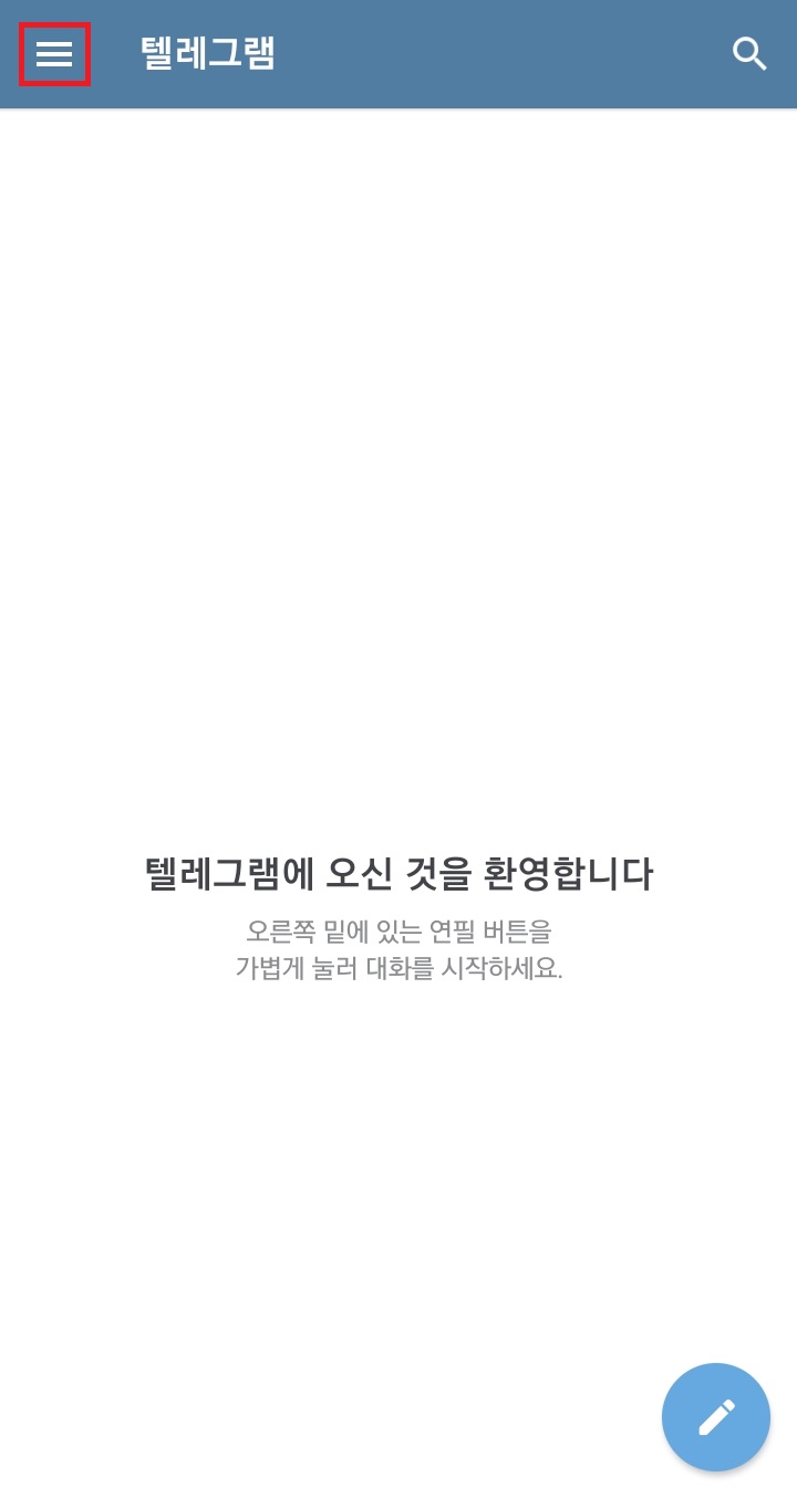 ✓ 텔레그램 앱에 접속하게 되면, 위와 같은 화면이 나오게 되는데요, 여기서 왼쪽 위에 보이시는 설정 메뉴를 눌러 들어가 줍니다.