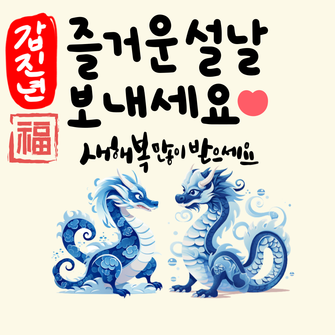 올 해는 푸른 용의 띠인 갑진년이라고 합니다. 이름에서도 볼 수 있듯 모두에게 갑진 한 해 보내셨으면 좋겠습니다. 즐거운 설 명절 보내시기 바랍니다. 새해 복 많이 받으세요