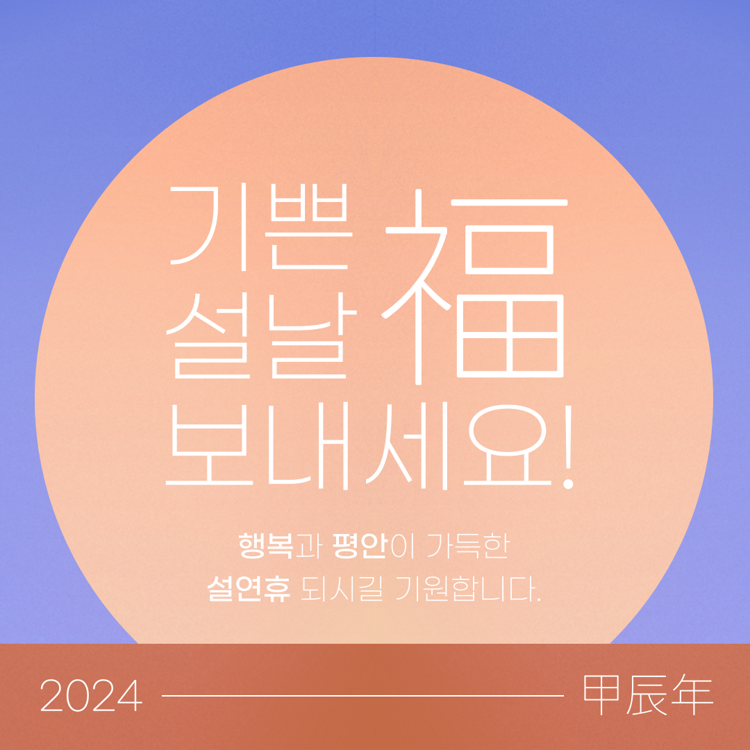 민족 최대의 명절 2024년 설날이 찾아왔습니다. 즐거운 설연휴 보내시고, 바라는 소망 모두 이뤄지는 한 해가 되길 바랍니다. 새해 복 많이 받으세요