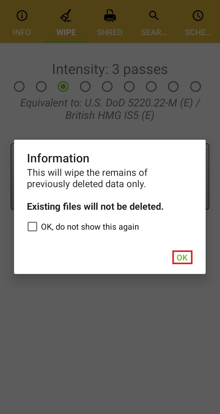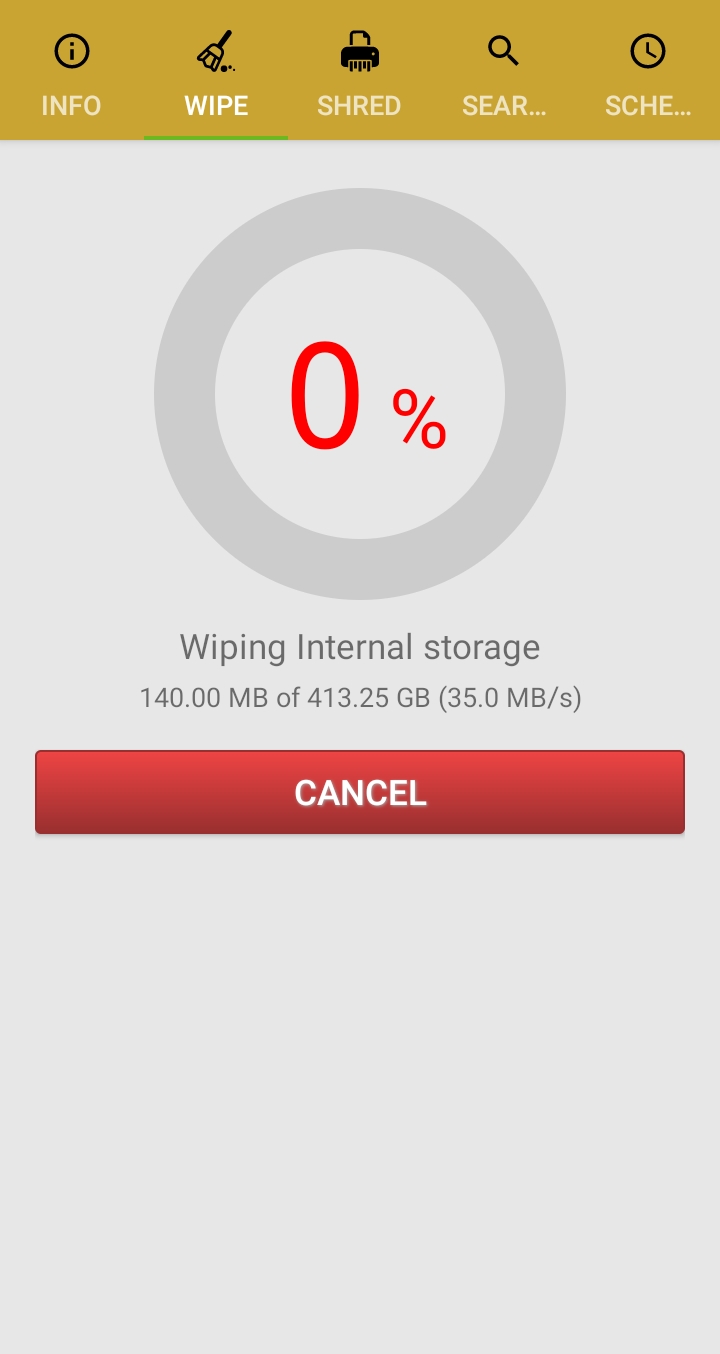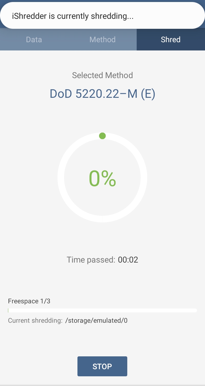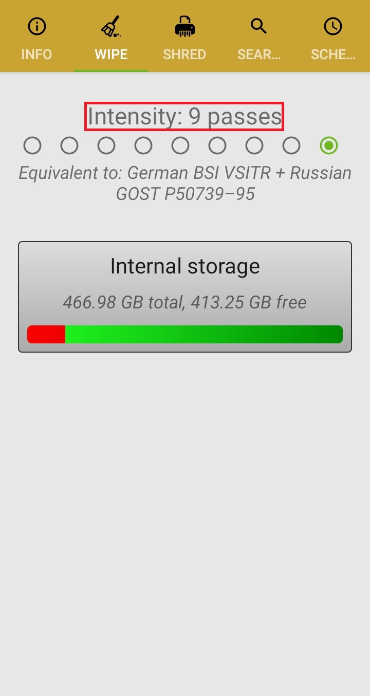 ✓ SHRED 항목을 눌러 들어가게 되면, 위처럼, 총 9단계로 스마트폰을 덮어씌우는 항목이 나오게 되는데요, 첫 번째에서 마지막 단계로 가면 갈수록, 빈 공간을 여러 번 덮어씌워, 복구가 불가능하도록 만들 수 있지만, 시간이 오래 걸리게 됩니다.