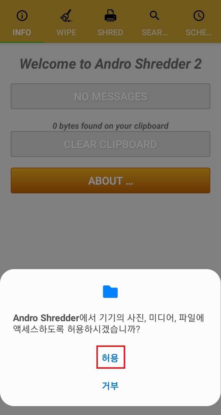 ✓ 안드로 슈레더를 설치하고 실행하게 되면, 위처럼 기기의 사진, 미디어, 파일에 액세스를 요구하는 화면이 나오게 됩니다. 여기서 허용을 눌러줍니다.