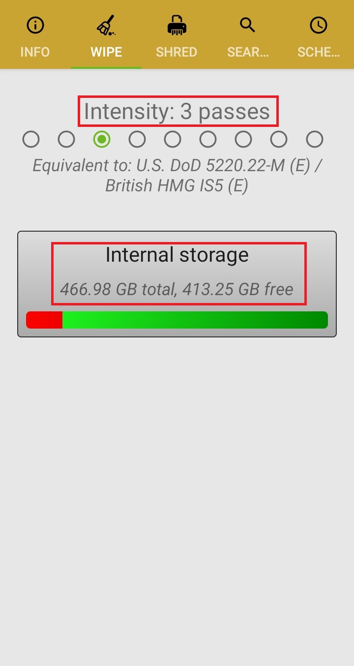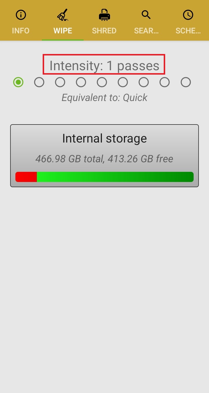 ✓ 기본적으로, 스마트폰 파일의 복구가 불가능하도록 하기 위해서는, 세 번 정도만 덮어씌워도 되기 때문에, Intensity를 3으로 설정해주신 후, 아래 Internal Storage를 눌러줍니다.