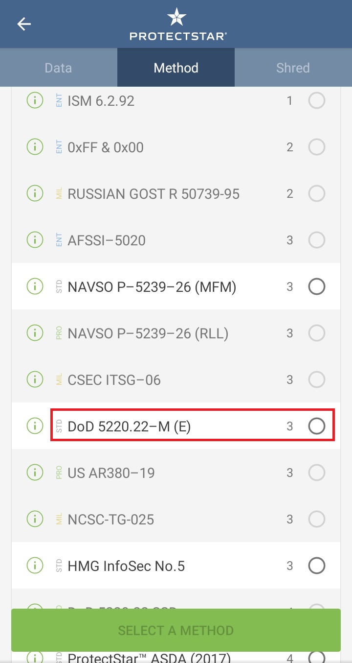 ✓ 그러면, 아까와 마찬가지로, 몇 번을 덮어씌울 건지에 관한 메뉴가 나오게 되는데요, 마찬가지로, 3번 덮어 씌우는 방식인, DoD 5220.22-M (E)을 선택하신 후, SHRED를 눌러줍니다.