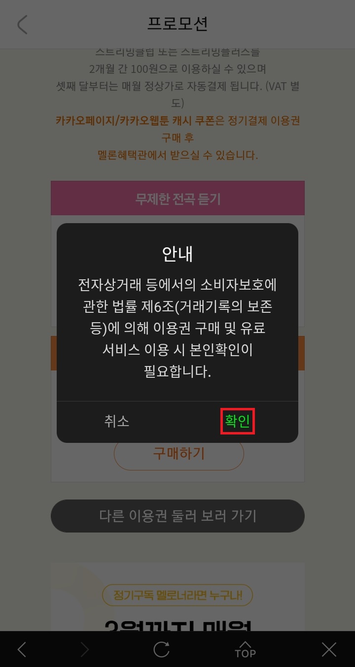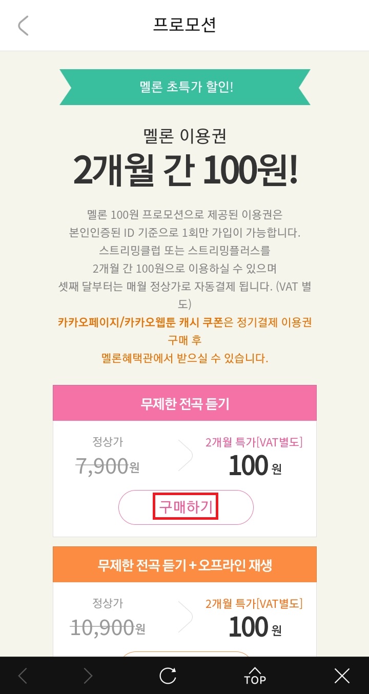 ✓ 2개월 팝업을 누르게 되면, 위처럼 프로모션 화면으로 다시 이동되는데요, 여기서 무제한 전곡 듣기 + 오프라인 재생이라는 프로모션을 구매해줍니다.