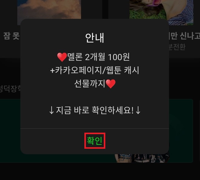 ✓ 위처럼, 새롭게 가입한 아이디로, 멜론에 접속하게 되면, 멜론 2개월 100원이라는 이벤트가 나타나게 되는데요, 여기서 확인을 눌러줍니다.