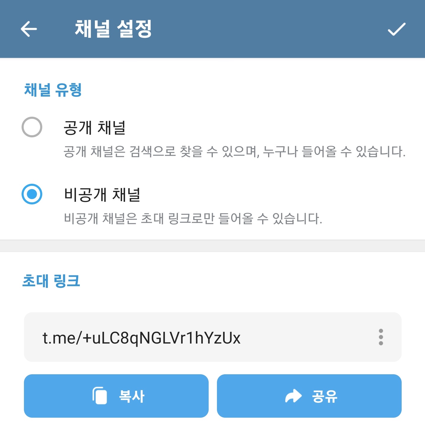 하지만 비공개 채널의 경우, 초대 링크가 암호화되어있으며, 이 링크를 받은 사람만 접속이 가능합니다.