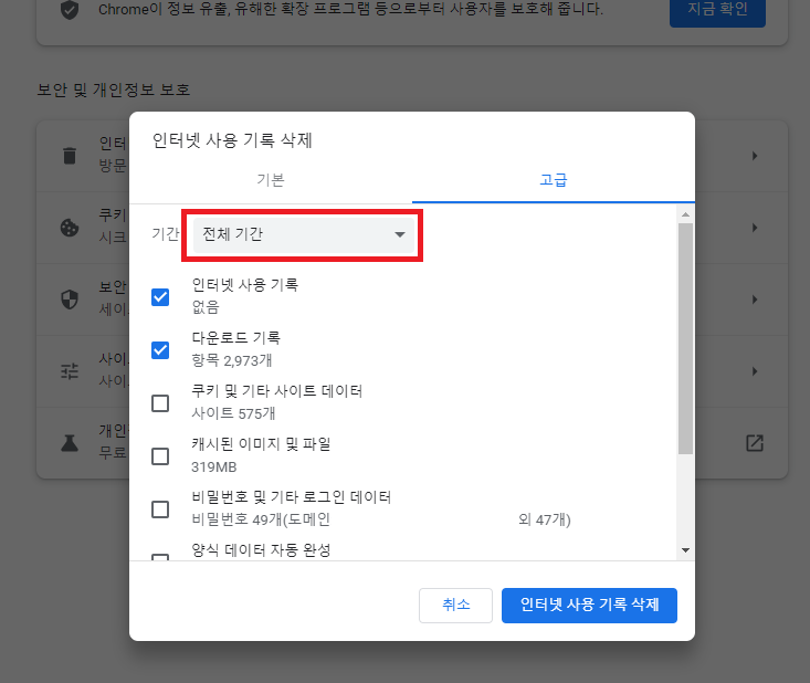 ✓ 인터넷 사용 기록 삭제를 누르게 되면, 위와 같은 화면이 나타나는데요, 여기서 기간은 전체 기간으로 설정해주시고, 아래 모든 항목에 체크해주신 후, 삭제 버튼을 눌러주시면 됩니다.