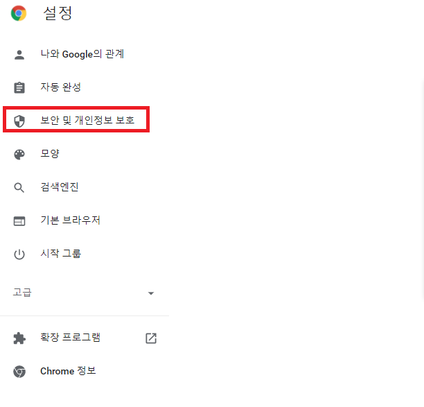 ✓ 설정 버튼을 누르게 되면, 좌측에 다양한 항목이 나타나는 것을 알 수 있는데요, 여기서 보안 및 개인정보 보호 항목을 눌러 들어갑니다.