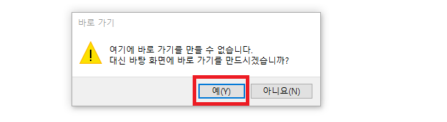 ✓ 바로 가기 만들기를 눌러주시게 되면, 위처럼 바탕 화면에 바로 가기를 만드시겠느냐는 문구가 나오게 되는데요, 여기서 예를 눌러줍니다.