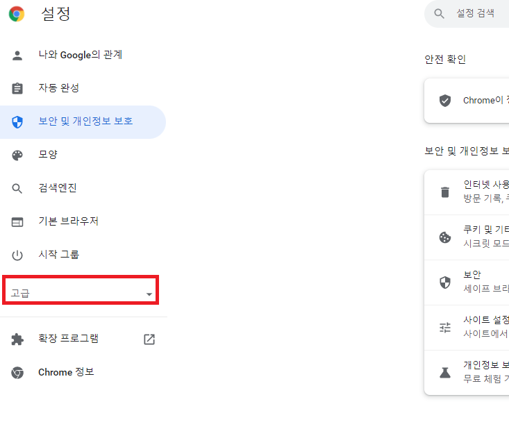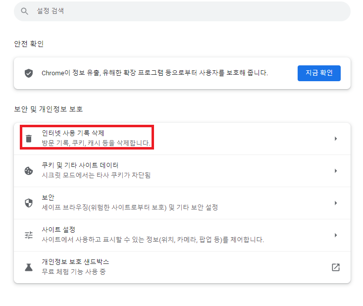 ✓ 보안 및 개인정보 보호 항목을 누르게 되면, 위처럼 다양한 메뉴가 나오게 되는데요, 여기서 인터넷 사용 기록 삭제를 눌러줍니다.