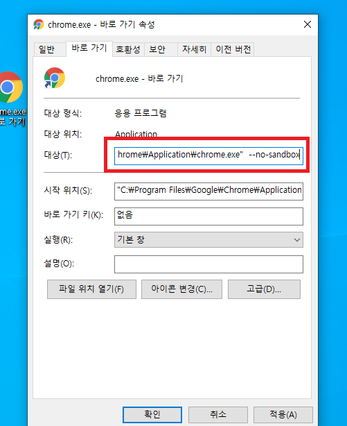 크롬 바로 가기 --no-sandbox