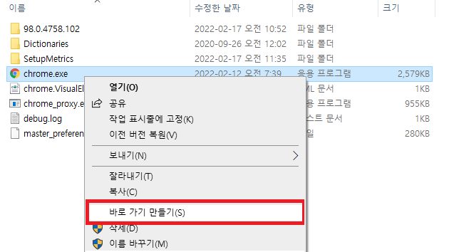 ✓ 파일 위치 열기를 눌러주시게 되면, 위처럼 크롬이 설치되어있는 폴더로 이동하게 되는데요, 여기서 크롬 실행 파일을 오른쪽 클릭하여, 바로 가기 만들기를 눌러주시면 됩니다.